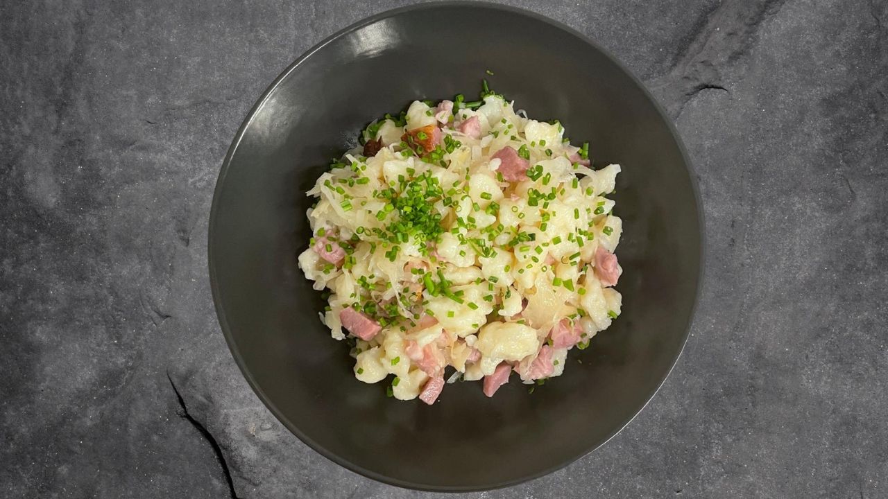 Halušky se zelím a uzenou krkovicí, smažená cibulka