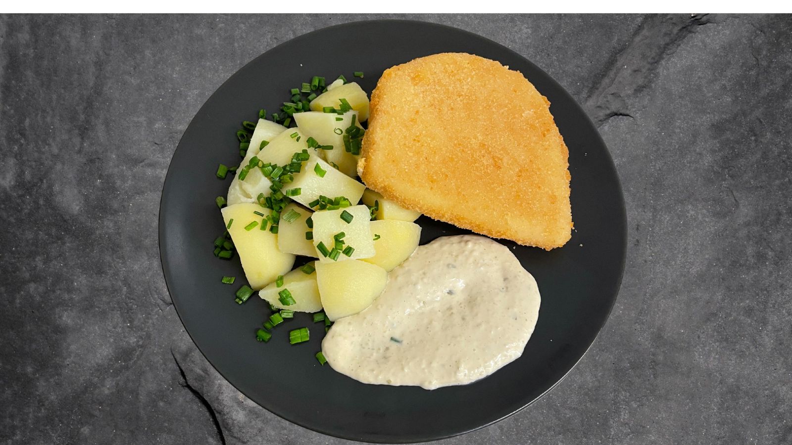 Holandský sekaný řízek, bramborová kaše, kyselá okurka