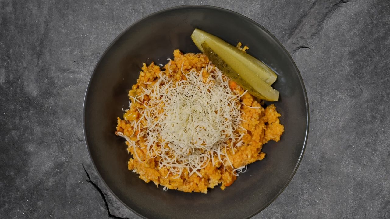 Srbské vepřové rizoto s kyselou okurkou a sypaným sýrem