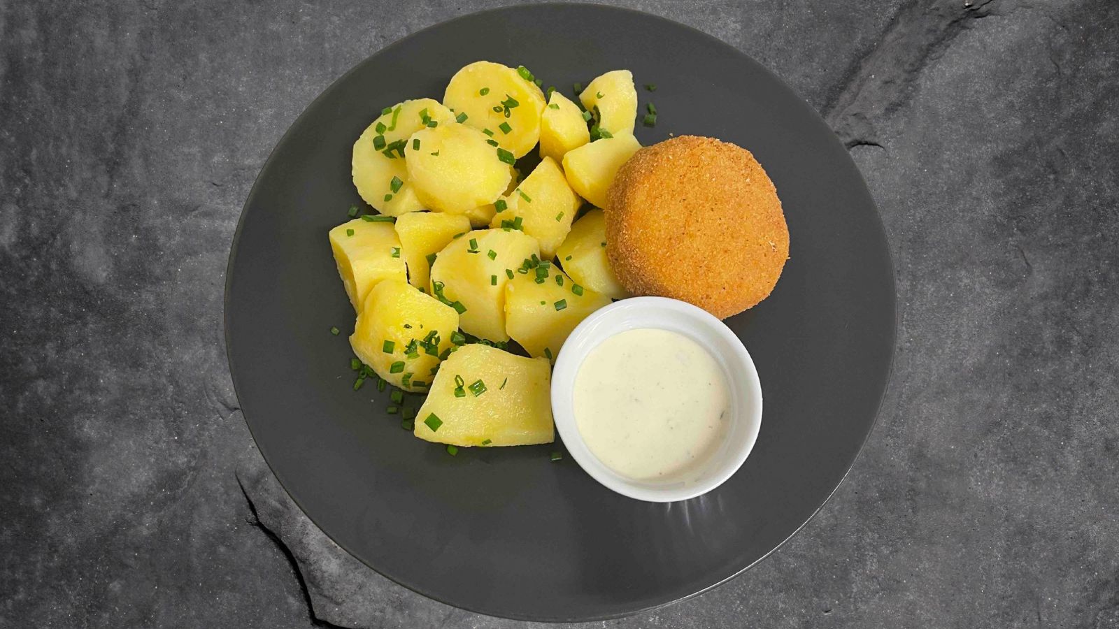 Smažený hermelín, vařené pažitkové brambory, tatarská omáčka