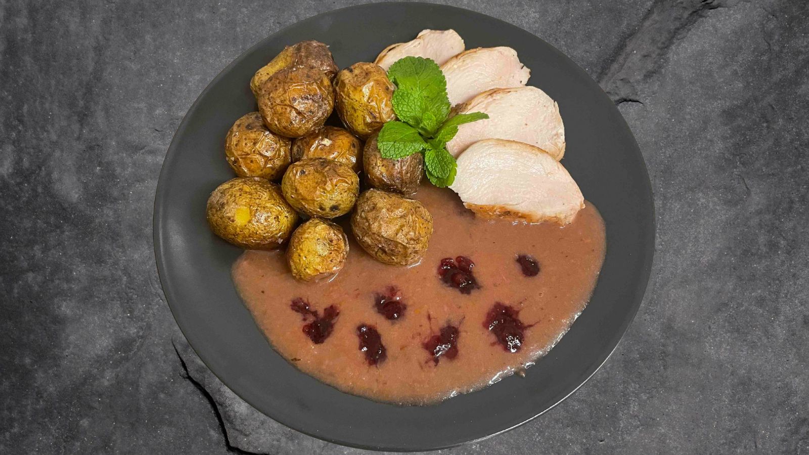 Kuřecí prsní plátky v brusinkové omáčce, opečené grenaille